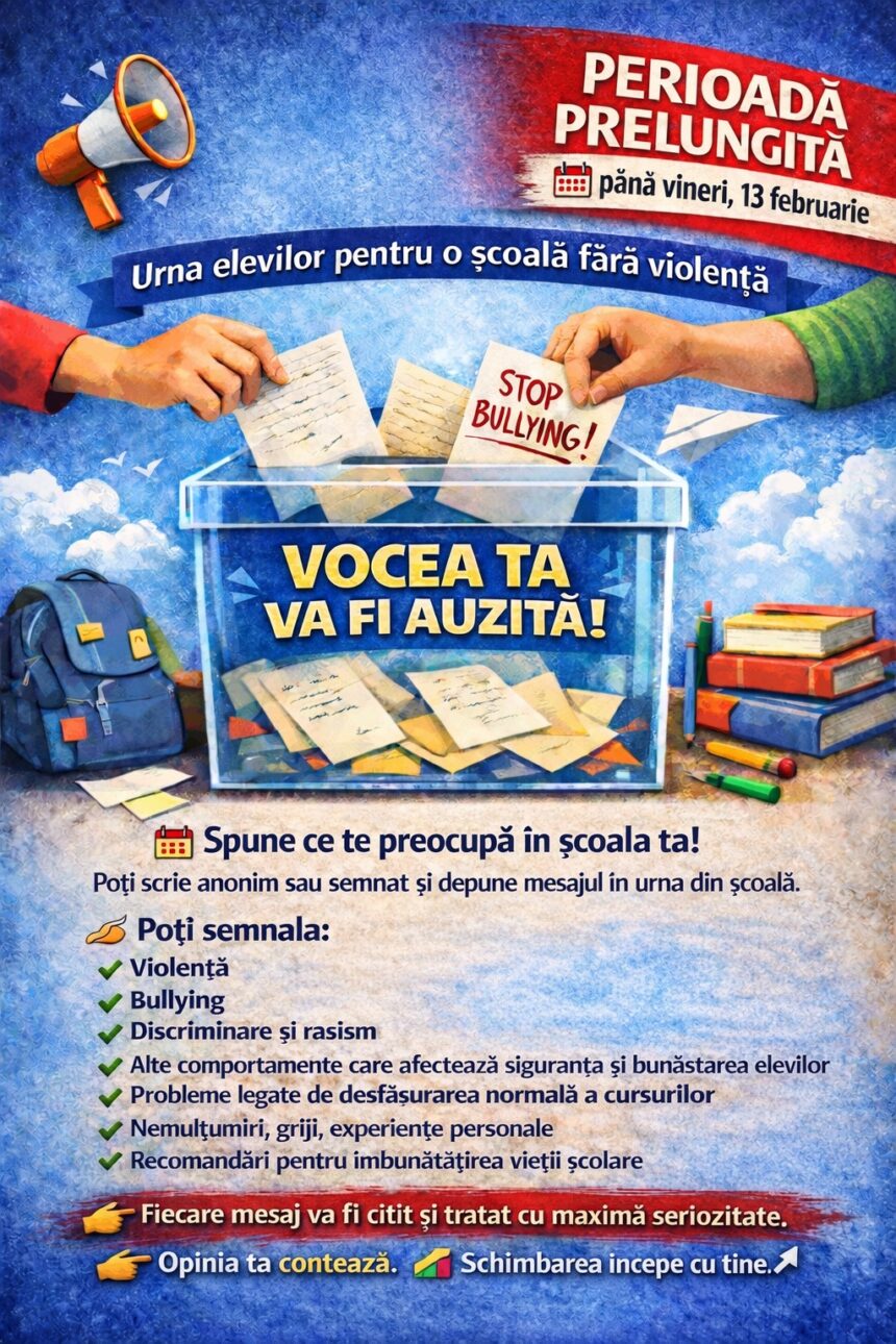 Pentru a oferi fiecărui elev o șansă reală de a se exprima, Prefectura Maramureș a decis prelungirea campaniei „Vocea ta va fi auzită!” cu încă o săptămână, până vineri, 13 februarie.