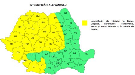 Meteorologii au emis astăzi o avertizare meteo Cod Galben de vânt care vizează mai multe județe din țară. Astfel în Maramureș, Banat, Crișana, Transilvania, vestul și sudul Olteniei vântul va avea intensificări temporare cu viteze de 50…70 km/h. În zona de munte vor fi intensificări ale vântului cu viteze de 70…90 km/h, iar la peste 1700 m vor fi rafale de 90…120 km/h. Intensificări de vânt vor mai fi și în restul țării, cu viteze de 40…50 km/h.