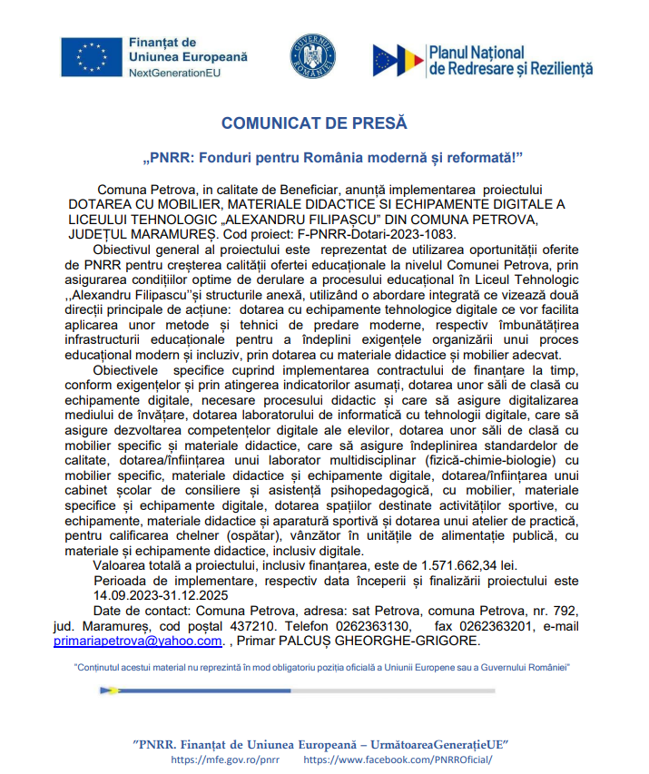 Comuna Petrova anunță implementarea proiectului ”DOTAREA CU MOBILIER, MATERIALE DIDACTICE SI ECHIPAMENTE DIGITALE A LICEULUI TEHNOLOGIC ALEXANDRU FILIPAȘCU”