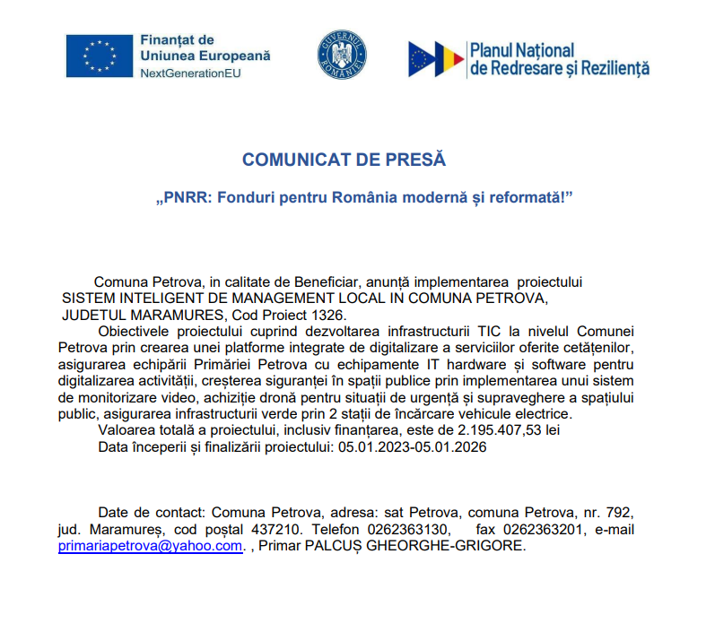 TV SIGHET > Blog > Stiri > Administrație > Comuna Petrova anunță implementarea proiectului ”SISTEM INTELIGENT DE MANAGEMENT LOCAL IN COMUNA PETROVA”