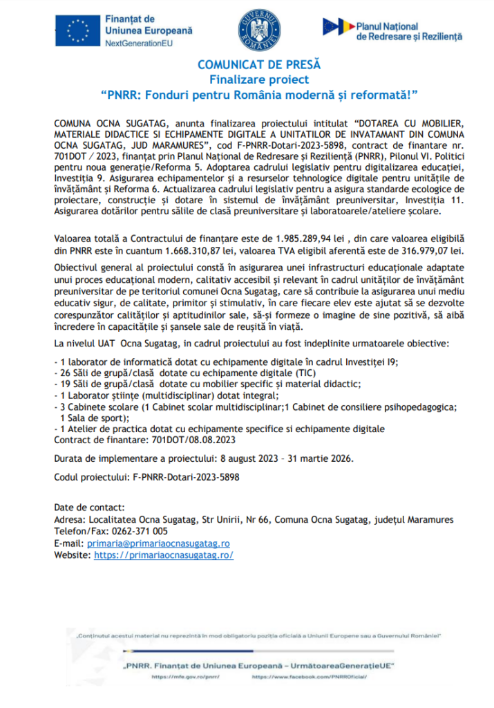COMUNICAT DE PRESĂ: Comuna Ocna Șugatag anunță finalizarea proiectului intitulat „Dotarea cu mobilier, materiale didactice și echipamente digitale a unităților de învățământ din comuna Ocna Șugatag”