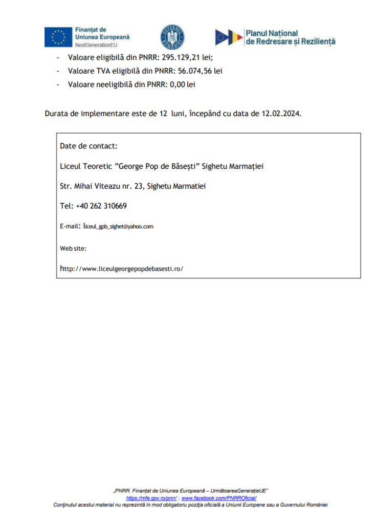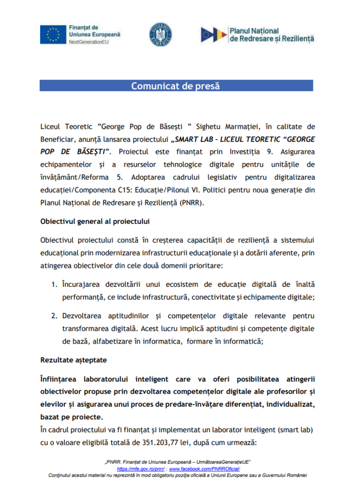 COMUNICAT DE PRESĂ: Dotarea Liceului Teoretic George Pop de Bășești Sighetu Marmației cu 1 laborator inteligent