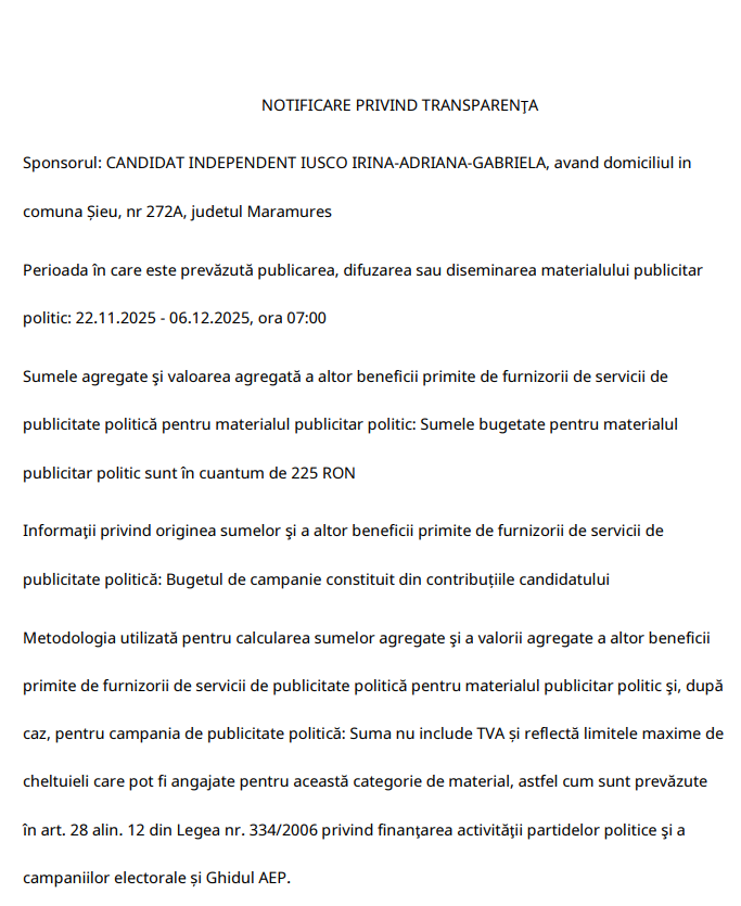 NOTIFICARE PRIVIND TRANSPARENŢA CANDIDAT INDEPENDENT