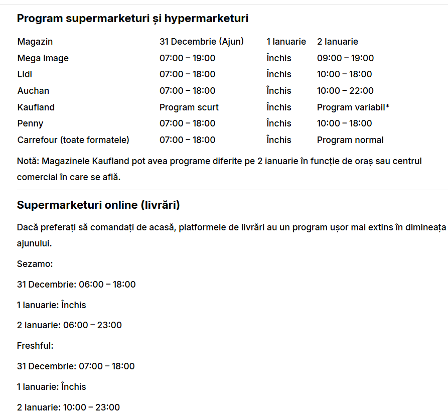 Pentru a evita aglomerația de ultim moment, este esențial să știți că majoritatea marilor retaileri vor funcționa după un program scurt în ajunul Revelionului, iar pe 1 ianuarie toate magazinele fizice vor fi închise.