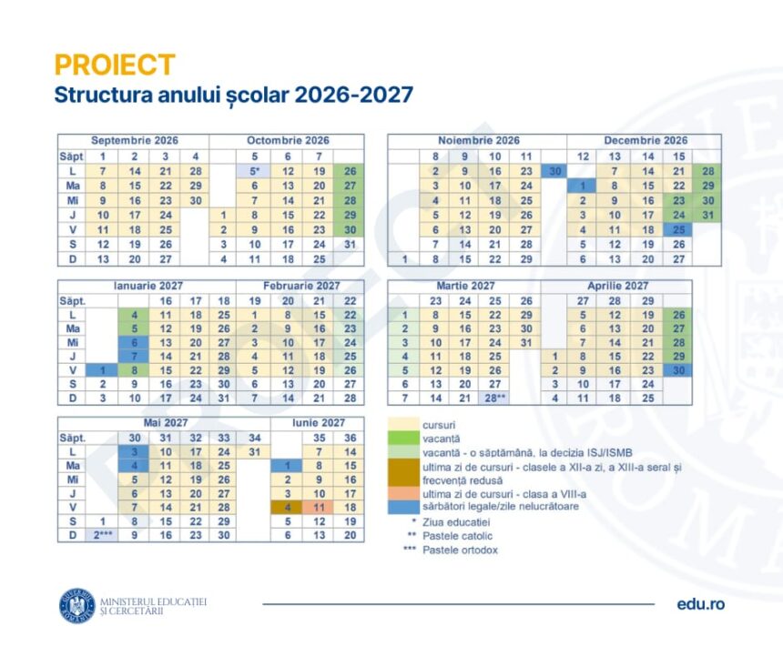 Forma finală a structurii anului școlar 2026-2027 va fi aprobată în urma analizei feedbackului primit pe adresa de e-mail dedicată consultării publice pentru acest proiect și după ședința Comisiei de Dialog Social (CDS) de la nivelul Ministerului Educației și Cercetării.