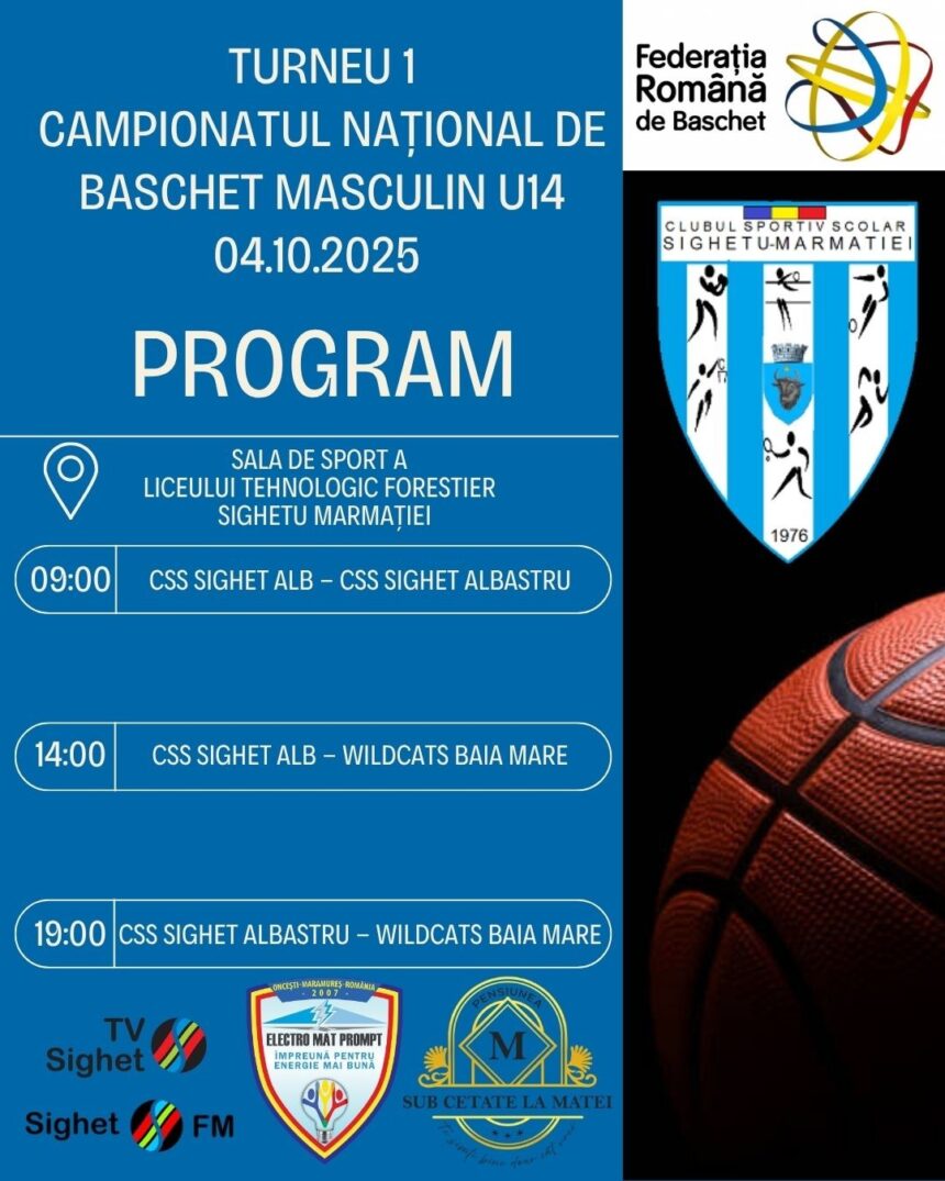 Clubul Sportiv Școlar Sighet găzduiește primul turneu din cadrul Campionatului Național de Baschet Masculin U14. Evenimentul sportiv va avea loc sâmbătă, 4 octombrie, în Sala de sport a Liceului Tehnologic Forestier din Sighetu Marmației, și face parte din seria celor 14 turnee care vor avea loc la nivel național.