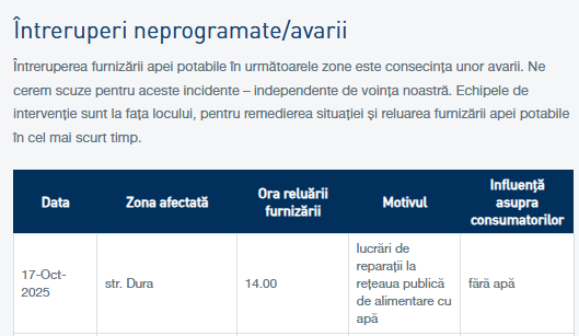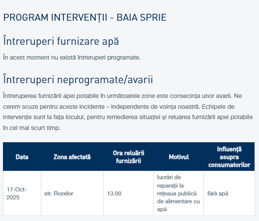 Servicii publiceStiri VITAL: Întreruperi ale furnizării apei în 17 octombrie Moldovan Dana publicat octombrie 17, 2025 Distribuie 0 Min de citit Distribuie Ti-ar putea placea si L-AȚI VĂZUT? Un tânăr de 20 de ani din localitatea Strămbu-Băiuț este căutat de polițiști și de familie VIDEO: Televiziunea și radioul, printre principalele surse de informare ale românilor VIDEO: Maramureșul are nevoie de sprijin urgent din partea Guvernului României VIDEO: Serviciile medicale de prevenție sunt gratuite, pentru toți românii, indiferent dacă sunt sau nu asigurați VIDEO: Polițiștii împreună cu reprezentanții RAR sunt prezenți pe drumurile publice Distribuie acest articole Facebook Twitter Copiaza link-ul Print Distribuie Articolul anterior Vremea va fi astăzi apropiată de normalul termic al perioadei Urmatorul articol VIDEO: Temperaturi mai ridicate decât cele specifice perioadei, până la jumătatea lunii noiembrie Lasa un comentariu Lasa un comentariu Lasă un răspuns Anulează răspunsulAdresa ta de email nu va fi publicată. Câmpurile obligatorii sunt marcate cu *Comentariu * Nume * Email * Site web Salvează-mi numele, emailul și site-ul web în acest navigator pentru data viitoare când o să comentez. Stay Connected13kFolloweriLike11kSubscribersSubscribeLatest News L-AȚI VĂZUT? Un tânăr de 20 de ani din localitatea Strămbu-Băiuț este căutat de polițiști și de familie Autorități Stiri octombrie 17, 2025 REPORTAJUL ZILEI: CONFERINȚĂ PROFESIONALĂ COMUNĂ CU PARTICIPANȚI DIN DOMENIUL JURIDIC Reportajul zilei octombrie 17, 2025 VIDEO: Televiziunea și radioul, printre principalele surse de informare ale românilor Social Stiri octombrie 17, 2025 VIDEO: Maramureșul are nevoie de sprijin urgent din partea Guvernului României Administrație Stiri octombrie 17, 2025