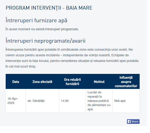 Servicii publiceStiri VITAL: Întreruperi ale furnizării apei joi, 16 aprilie Moldovan Dana publicat aprilie 16, 2026 Distribuie 0 Min de citit Distribuie Ti-ar putea placea si Temperaturi de până la 22 de grade astăzi în Maramureș Sumă importantă de bani descoperită asupra unui bărbat Totul s-a scumpit în ultimul an pe fondul mai multor crize care s-au suprapus Federația Română de Baschet anunță demararea înscrierilor pentru taberele naționale de baschet 2026 Sfaturi simple ca să îți revii după excesele de la masa de Paște Distribuie acest articole Facebook Twitter Copiaza link-ul Print Distribuie Articolul anterior REPORTAJUL ZILEI: CONSILIUL LOCAL SIGHET A DECIS DESFIINȚAREA SERVICIULUI PUBLIC DE GOSPODĂRIRE URBANA Urmatorul articol Temperaturi de până la 22 de grade astăzi în Maramureș Lasa un comentariu Lasa un comentariu Lasă un răspuns Anulează răspunsulAdresa ta de email nu va fi publicată. Câmpurile obligatorii sunt marcate cu *Comentariu * Nume * Email * Site web Salvează-mi numele, emailul și site-ul web în acest navigator pentru data viitoare când o să comentez. Stay Connected13kFolloweriLike11kSubscribersSubscribeLatest News Temperaturi de până la 22 de grade astăzi în Maramureș Breaking News Stiri aprilie 16, 2026 REPORTAJUL ZILEI: CONSILIUL LOCAL SIGHET A DECIS DESFIINȚAREA SERVICIULUI PUBLIC DE GOSPODĂRIRE URBANA Reportajul zilei aprilie 15, 2026 Sumă importantă de bani descoperită asupra unui bărbat Breaking News Stiri aprilie 15, 2026 Totul s-a scumpit în ultimul an pe fondul mai multor crize care s-au suprapus Social Stiri aprilie 15, 2026
