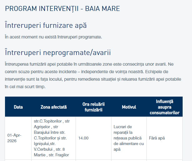 Servicii publiceStiri VITAL: Întreruperi ale furnizării apei miercuri, 1 aprilie Moldovan Dana publicat aprilie 1, 2026 Distribuie 0 Min de citit Distribuie Ti-ar putea placea si Restricţii de circulaţie pe teritoriul Ungariei pentru autovehiculele de mare tonaj, în perioada Paștelui Catolic Sighetenii și iubitorii de muzică religioasă, invitați la Festivalul „Cântați Domnului, cântați” Guvernul a decis actualizarea chiriilor pentru locuințele de stat, după aproape 20 de ani UPDATE PERCHEZIȚII: 8 persoane pentru 24 de ore, sume de bani și articole pirotehnice ridicate, precum și peste 150 mc lemn indisponibilizat de polițiști VITAL: Întreruperi ale furnizării apei vineri, 3 aprilie Distribuie acest articole Facebook Twitter Copiaza link-ul Print Distribuie Articolul anterior Prognoza meteo pentru 1 aprilie Urmatorul articol Cum a apărut „ziua păcălelilor” Lasa un comentariu Lasa un comentariu Lasă un răspuns Anulează răspunsulAdresa ta de email nu va fi publicată. Câmpurile obligatorii sunt marcate cu *Comentariu * Nume * Email * Site web Salvează-mi numele, emailul și site-ul web în acest navigator pentru data viitoare când o să comentez. Stay Connected13kFolloweriLike11kSubscribersSubscribeLatest News Restricţii de circulaţie pe teritoriul Ungariei pentru autovehiculele de mare tonaj, în perioada Paștelui Catolic Breaking News Stiri aprilie 3, 2026 Anunț public privind depunerea solicitării de emitere a acordului de mediu Anunțuri videotext aprilie 3, 2026 Sighetenii și iubitorii de muzică religioasă, invitați la Festivalul „Cântați Domnului, cântați” Evenimente locale Stiri aprilie 3, 2026 Guvernul a decis actualizarea chiriilor pentru locuințele de stat, după aproape 20 de ani Administrație Stiri aprilie 3, 2026