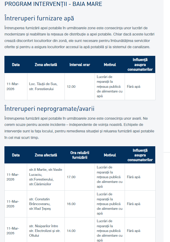 Servicii publiceStiri VITAL: Întreruperi ale furnizării apei miercuri, 11 martie Moldovan Dana publicat martie 11, 2026 Distribuie 0 Min de citit Distribuie Ti-ar putea placea si Un val de frig neobişnuit loveşte România chiar de 1 Mai Spitalul Judetean de Urgenta devine Spitalul Clinic Judetean de Urgenta „Dr. Constantin Opris” Baia Mare Programul „Fertilizare in vitro” continuă până în 2030. Ce valoare au voucherele oferite de Guvern Preşedintele Nicuşor Dan a promulgat Legea pentru prevenirea și combaterea femicidului Vezi cum va fi vremea astăzi în Maramureș Distribuie acest articole Facebook Twitter Copiaza link-ul Print Distribuie Articolul anterior Temperaturi de până la 19 grade astăzi în Maramureș Urmatorul articol VIDEO: Circulație restricționată pe strada Corbului din Sighet Lasa un comentariu Lasa un comentariu Lasă un răspuns Anulează răspunsulAdresa ta de email nu va fi publicată. Câmpurile obligatorii sunt marcate cu *Comentariu * Nume * Email * Site web Salvează-mi numele, emailul și site-ul web în acest navigator pentru data viitoare când o să comentez. Stay Connected13kFolloweriLike11kSubscribersSubscribeLatest News Un val de frig neobişnuit loveşte România chiar de 1 Mai Breaking News Stiri aprilie 24, 2026 Spitalul Judetean de Urgenta devine Spitalul Clinic Judetean de Urgenta „Dr. Constantin Opris” Baia Mare Administrație Sănătate Stiri aprilie 24, 2026 Programul „Fertilizare in vitro” continuă până în 2030. Ce valoare au voucherele oferite de Guvern Sănătate Social Stiri aprilie 24, 2026 Preşedintele Nicuşor Dan a promulgat Legea pentru prevenirea și combaterea femicidului Autorități Social Stiri aprilie 24, 2026