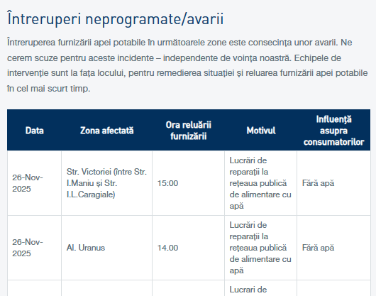 Servicii publiceStiri VITAL: Întreruperi ale furnizării apei pe mai multe străzi din Baia Mare Moldovan Dana publicat noiembrie 26, 2025 Distribuie 0 Min de citit Distribuie Ti-ar putea placea si Vezi cum va fi vremea miercuri, 26 noiembrie VIDEO: Centrul de zi pentru copii din comuna Bârsana este aproape finalizat VIDEO: Lucrările de consolidare și reabilitare a clădirii Școlii gimnaziale nr.2 din Sighet vor fi finanțate de Ministerul Dezvoltării, Lucrărilor Publice și Administrației VIDEO: Salvamontiștii au intervenit pentru recuperarea unui bărbat, victimă a unui accident forestier 20 000 români ar putea rămâne fără locuri de muncă după reforma în companiile de stat Distribuie acest articole Facebook Twitter Copiaza link-ul Print Distribuie Articolul anterior Vezi cum va fi vremea miercuri, 26 noiembrie Lasa un comentariu Lasa un comentariu Lasă un răspuns Anulează răspunsulAdresa ta de email nu va fi publicată. Câmpurile obligatorii sunt marcate cu *Comentariu * Nume * Email * Site web Salvează-mi numele, emailul și site-ul web în acest navigator pentru data viitoare când o să comentez. Stay Connected13kFolloweriLike11kSubscribersSubscribeLatest News Vezi cum va fi vremea miercuri, 26 noiembrie Breaking News Stiri noiembrie 26, 2025 VIDEO: Centrul de zi pentru copii din comuna Bârsana este aproape finalizat Administrație Stiri noiembrie 25, 2025 VIDEO: Lucrările de consolidare și reabilitare a clădirii Școlii gimnaziale nr.2 din Sighet vor fi finanțate de Ministerul Dezvoltării, Lucrărilor Publice și Administrației Administrație Stiri noiembrie 25, 2025 VIDEO: Salvamontiștii au intervenit pentru recuperarea unui bărbat, victimă a unui accident forestier Breaking News Stiri noiembrie 25, 2025