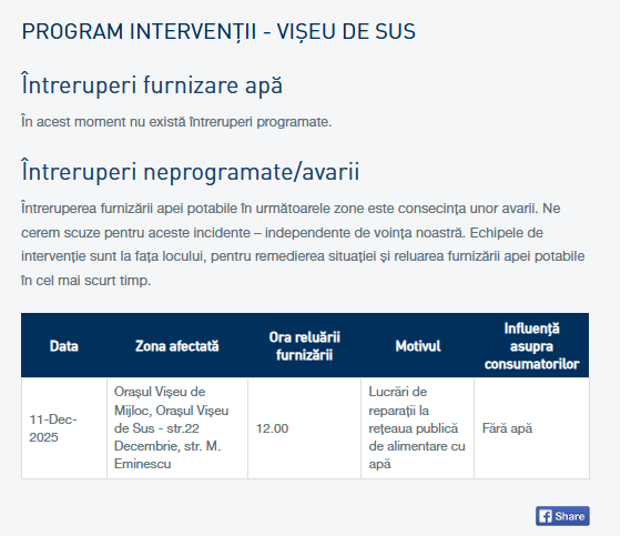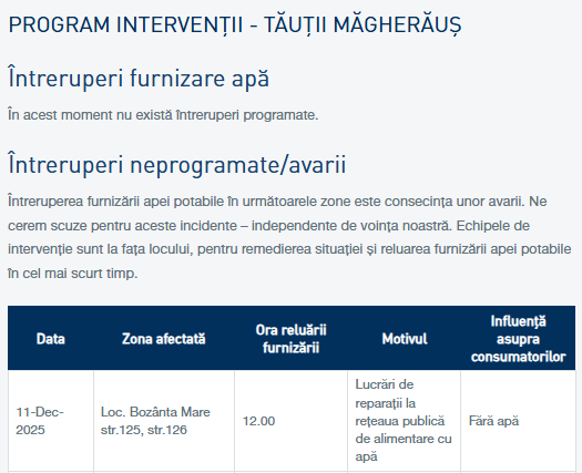 Servicii publiceStiri VITAL: Vezi unde se întrerupe furnizarea apei joi, 11 decembrie Moldovan Dana publicat decembrie 11, 2025 Distribuie 0 Min de citit Distribuie Ti-ar putea placea si Percheziții domiciliare, într-un dosar penal ce vizează comiterea infracțiunii de evaziune fiscală Legea „Nordis” a intrat în vigoare. Ce garanții primesc cei care cumpără apartamente în faza de proiect Sistemul de Intrare/Ieșire (EES) funcționează de din 10 decembrie cu preluarea datelor biometrice în punctele operaționale din România Vezi cum va fi vremea joi, 11 decembrie VIDEO: Icoana și racla cu o părticică din moaștele Sfântului Nectarie, aduse spre cinstire în Sighetu Marmației Distribuie acest articole Facebook Twitter Copiaza link-ul Print Distribuie Articolul anterior Percheziții domiciliare, într-un dosar penal ce vizează comiterea infracțiunii de evaziune fiscală Lasa un comentariu Lasa un comentariu Lasă un răspuns Anulează răspunsulAdresa ta de email nu va fi publicată. Câmpurile obligatorii sunt marcate cu *Comentariu * Nume * Email * Site web Salvează-mi numele, emailul și site-ul web în acest navigator pentru data viitoare când o să comentez. Stay Connected13kFolloweriLike11kSubscribersSubscribeLatest News Percheziții domiciliare, într-un dosar penal ce vizează comiterea infracțiunii de evaziune fiscală Breaking News Stiri decembrie 11, 2025 Legea „Nordis” a intrat în vigoare. Ce garanții primesc cei care cumpără apartamente în faza de proiect Administrație Autorități Stiri decembrie 11, 2025 Sistemul de Intrare/Ieșire (EES) funcționează de din 10 decembrie cu preluarea datelor biometrice în punctele operaționale din România Autorități Stiri decembrie 11, 2025 Vezi cum va fi vremea joi, 11 decembrie Breaking News Stiri decembrie 11, 2025