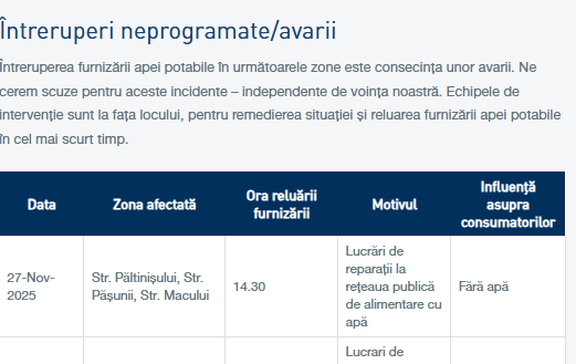 Servicii publiceStiri VITAL: Vezi unde se întrerupe furnizarea apei joi, 27 noiembrie Moldovan Dana publicat noiembrie 27, 2025 Distribuie 0 Min de citit Distribuie Baia Mare Tăuții Măgherăuș Ti-ar putea placea si Cristian-AugustinNiculescu-Țâgârlaș: Maramureșul – ambasador al identității românești în India Jandarmii maramureșeni, prezenți și anul acesta la activitățile dedicate Zilei Naționale a României Vreme rece și mohorâtă astăzi VIDEO: Ministrul Muncii, Petre-Florin Manole, s-a întâlnit cu meșteșugarii din Maramureș VIDEO: Municipiul Sighetu Marmației va intra în atmosfera sărbătorilor de iarnă în 1 decembrie Distribuie acest articole Facebook Twitter Copiaza link-ul Print Distribuie Articolul anterior Vreme rece și mohorâtă astăzi Urmatorul articol Jandarmii maramureșeni, prezenți și anul acesta la activitățile dedicate Zilei Naționale a României Lasa un comentariu Lasa un comentariu Lasă un răspuns Anulează răspunsulAdresa ta de email nu va fi publicată. Câmpurile obligatorii sunt marcate cu *Comentariu * Nume * Email * Site web Salvează-mi numele, emailul și site-ul web în acest navigator pentru data viitoare când o să comentez. Stay Connected13kFolloweriLike11kSubscribersSubscribeLatest News Cristian-AugustinNiculescu-Țâgârlaș: Maramureșul – ambasador al identității românești în India Politic Stiri noiembrie 27, 2025 Jandarmii maramureșeni, prezenți și anul acesta la activitățile dedicate Zilei Naționale a României Evenimente locale Stiri noiembrie 27, 2025 Vreme rece și mohorâtă astăzi Breaking News Stiri noiembrie 27, 2025 VIDEO: Ministrul Muncii, Petre-Florin Manole, s-a întâlnit cu meșteșugarii din Maramureș Evenimente locale Stiri noiembrie 26, 2025