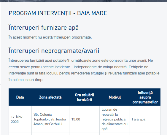 Servicii publiceStiri VITAL: Vezi unde se întrerupe furnizarea apei luni, 17 noiembrie Moldovan Dana publicat noiembrie 17, 2025 Distribuie 0 Min de citit Distribuie Ti-ar putea placea si Vremea va fi astăzi mult mai caldă decât normalul termic al perioadei Vremea va fi caldă și astăzi VIDEO: Fetița de 11 ani internată în stare de malnutriţie va fi plasată în grija unui asistent maternal VIDEO: Soluții pentru asigurarea debitului necesar hidranților exteriori la Școala Gimnazială ” Ioan Buteanu” VIDEO: Recomandările jandarmilor maramureșeni pentru participarea la competiții sportive Distribuie acest articole Facebook Twitter Copiaza link-ul Print Distribuie Articolul anterior Vremea va fi astăzi mult mai caldă decât normalul termic al perioadei Lasa un comentariu Lasa un comentariu Lasă un răspuns Anulează răspunsulAdresa ta de email nu va fi publicată. Câmpurile obligatorii sunt marcate cu *Comentariu * Nume * Email * Site web Salvează-mi numele, emailul și site-ul web în acest navigator pentru data viitoare când o să comentez. Stay Connected13kFolloweriLike11kSubscribersSubscribeLatest News Vremea va fi astăzi mult mai caldă decât normalul termic al perioadei Breaking News Stiri noiembrie 17, 2025 Vremea va fi caldă și astăzi Breaking News Stiri noiembrie 15, 2025 REPORTAJUL ZILEI: CREDINCIOȘII SE PREGĂTESC SPIRITUAL PENTRU SĂRBĂTOAREA NAȘTERII DOMNULUI Reportajul zilei noiembrie 14, 2025 VIDEO: Fetița de 11 ani internată în stare de malnutriţie va fi plasată în grija unui asistent maternal Breaking News Stiri noiembrie 14, 2025