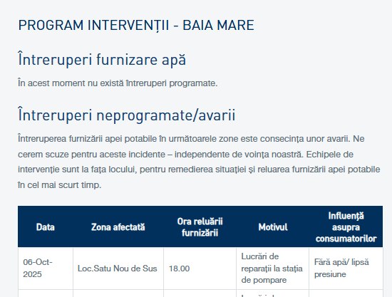 Servicii publiceStiri VITAL: Vezi unde se întrerupe furnizarea apei luni, 6 octombrie Moldovan Dana publicat octombrie 6, 2025 Distribuie 0 Min de citit Distribuie Ti-ar putea placea si Alertă de vreme rece în toată țara Săptămâna începe cu frig, ploi și ninsori A nins noaptea trecuta in Pasul Prislop. Vreme deosebit de rece si astazi VIDEO: Stagiu militar voluntar de 4 luni pentru românii între 18-35 de ani VIDEO: Donație făcută secției A.T.I. de preotul Nicolae Lauruc Distribuie acest articole Facebook Twitter Copiaza link-ul Print Distribuie Articolul anterior A nins noaptea trecuta in Pasul Prislop. Vreme deosebit de rece si astazi Urmatorul articol Săptămâna începe cu frig, ploi și ninsori Lasa un comentariu Lasa un comentariu Lasă un răspuns Anulează răspunsulAdresa ta de email nu va fi publicată. Câmpurile obligatorii sunt marcate cu *Comentariu * Nume * Email * Site web Salvează-mi numele, emailul și site-ul web în acest navigator pentru data viitoare când o să comentez. Stay Connected13kFolloweriLike11kSubscribersSubscribeLatest News Alertă de vreme rece în toată țara Breaking News Stiri octombrie 6, 2025 Săptămâna începe cu frig, ploi și ninsori Breaking News Stiri octombrie 6, 2025 A nins noaptea trecuta in Pasul Prislop. Vreme deosebit de rece si astazi Breaking News Stiri octombrie 4, 2025 MANIFEST: ȘEDINȚA ORDINARĂ A CONSILIULUI LOCAL SIGHET DIN LUNA SEPTEMBRIE Manifest octombrie 3, 2025