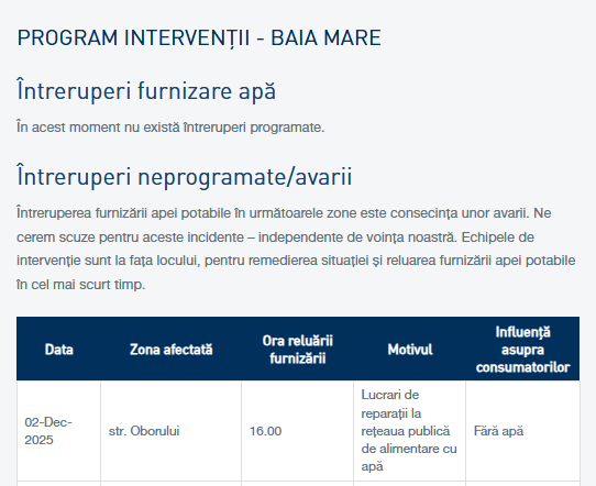 Servicii publiceStiriUncategorized VITAL: Vezi unde se întrerupe furnizarea apei, marți, 2 decembrie Moldovan Dana publicat decembrie 2, 2025 Distribuie 0 Min de citit Distribuie Ti-ar putea placea si Tradiții și obiceiuri respectate pe 6 decembrie Alegeri locale 2025: Cum afli secția unde ești arondat pentru a vota Înaintări în grad la Jandarmeria Maramureș cu prilejul Zilei Naționale a României Vremea se menține caldă și astăzi Vezi cum va fi vremea luni, 1 decembrie Distribuie acest articole Facebook Twitter Copiaza link-ul Print Distribuie Articolul anterior REPORTAJUL ZILEI: ASTĂZI ROMÂNIA SĂRBĂTOREȘTE ZIUA NAȚIONALĂ Urmatorul articol Vremea se menține caldă și astăzi Lasa un comentariu Lasa un comentariu Lasă un răspuns Anulează răspunsulAdresa ta de email nu va fi publicată. Câmpurile obligatorii sunt marcate cu *Comentariu * Nume * Email * Site web Salvează-mi numele, emailul și site-ul web în acest navigator pentru data viitoare când o să comentez. Stay Connected13kFolloweriLike11kSubscribersSubscribeLatest News Tradiții și obiceiuri respectate pe 6 decembrie Evenimente locale Stiri decembrie 2, 2025 Alegeri locale 2025: Cum afli secția unde ești arondat pentru a vota Administrație Stiri decembrie 2, 2025 MANIFEST | ANSAMBLUL FOLCLORIC „MARA” , 57 DE ANI DE TRADIȚIE ȘI CONTINUITATE FOLCLORICĂ Manifest decembrie 2, 2025 Înaintări în grad la Jandarmeria Maramureș cu prilejul Zilei Naționale a României Evenimente locale Stiri decembrie 2, 2025