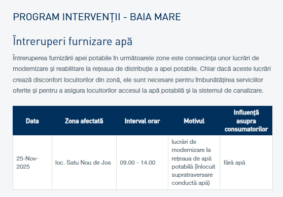 Servicii publiceStiri VITAL: Vezi unde se întrerupe furnizarea apei marți, 25 noiembrie Moldovan Dana publicat noiembrie 25, 2025 Distribuie 0 Min de citit Distribuie Ti-ar putea placea si Vremea se va încălzi față de ziua precedentă VIDEO: Măsuri luate în contextul începerii campaniei electorale pentru alegerile locale parțiale pentru primari în comunele Șieu și Poienile de Sub Munte VIDEO: Calea ferată Salva – Vișeu de Jos – Sighetu Marmației, riscă din nou să fie închisă O tânără a ajuns la spital după ce a fost mușcată de ploșnițe într-un vagon cușetă pe ruta București – Sighetu Marmației Înfrângere dureroasă pe teren propriu pentru CSM Sighet Distribuie acest articole Facebook Twitter Copiaza link-ul Print Distribuie Articolul anterior Vremea se va încălzi față de ziua precedentă Lasa un comentariu Lasa un comentariu Lasă un răspuns Anulează răspunsulAdresa ta de email nu va fi publicată. Câmpurile obligatorii sunt marcate cu *Comentariu * Nume * Email * Site web Salvează-mi numele, emailul și site-ul web în acest navigator pentru data viitoare când o să comentez. Stay Connected13kFolloweriLike11kSubscribersSubscribeLatest News Vremea se va încălzi față de ziua precedentă Breaking News Stiri noiembrie 25, 2025 VIDEO: Măsuri luate în contextul începerii campaniei electorale pentru alegerile locale parțiale pentru primari în comunele Șieu și Poienile de Sub Munte Autorități Stiri noiembrie 24, 2025 REPORTAJUL ZILEI | ANSAMBLUL „MARA” , 57 DE ANI DE TRADIȚIE ȘI CONTINUITATE FOLCLORICĂ Reportajul zilei noiembrie 24, 2025 VIDEO: Calea ferată Salva – Vișeu de Jos – Sighetu Marmației, riscă din nou să fie închisă Breaking News Stiri noiembrie 24, 2025