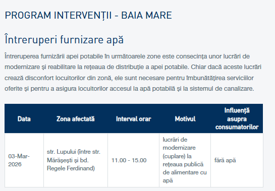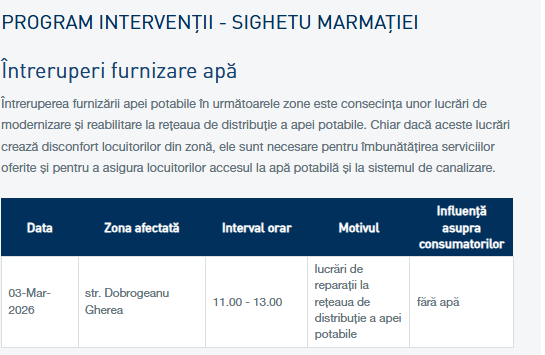 Servicii publiceStiri VITAL: Vezi unde se întrerupe furnizarea apei marți, 3 martie Moldovan Dana publicat martie 3, 2026 Distribuie 0 Min de citit Distribuie Ti-ar putea placea si SORIN VLAȘIN: PSD nu renunță la măsurile sociale pe care le-a promovat în toate guvernările Prognoza meteo marți, 3 martie MANIFEST: ȘEDINȚA ORDINARĂ A CONSILIULUI JUDEȚEAN MARAMUREȘ DIN LUNA FEBRUARIE VIDEO: Ministerul Educației a aprobat calendarul înscrierii în clasa pregătitoare 2026–2027 VIDEO: A fost aprobată stema Municipiului Sighetu Marmației Distribuie acest articole Facebook Twitter Copiaza link-ul Print Distribuie Articolul anterior Prognoza meteo marți, 3 martie Urmatorul articol SORIN VLAȘIN: PSD nu renunță la măsurile sociale pe care le-a promovat în toate guvernările Lasa un comentariu Lasa un comentariu Lasă un răspuns Anulează răspunsulAdresa ta de email nu va fi publicată. Câmpurile obligatorii sunt marcate cu *Comentariu * Nume * Email * Site web Salvează-mi numele, emailul și site-ul web în acest navigator pentru data viitoare când o să comentez. Stay Connected13kFolloweriLike11kSubscribersSubscribeLatest News SORIN VLAȘIN: PSD nu renunță la măsurile sociale pe care le-a promovat în toate guvernările Politic Stiri martie 3, 2026 Prognoza meteo marți, 3 martie Breaking News La casa cu voie bună martie 3, 2026 MANIFEST: ȘEDINȚA ORDINARĂ A CONSILIULUI JUDEȚEAN MARAMUREȘ DIN LUNA FEBRUARIE Evenimente locale Manifest martie 2, 2026 REPORTAJUL ZILEI: BILANȚUL ANULUI 2025 LA ITPF SIGHETU MARMAȚIEI Reportajul zilei martie 2, 2026